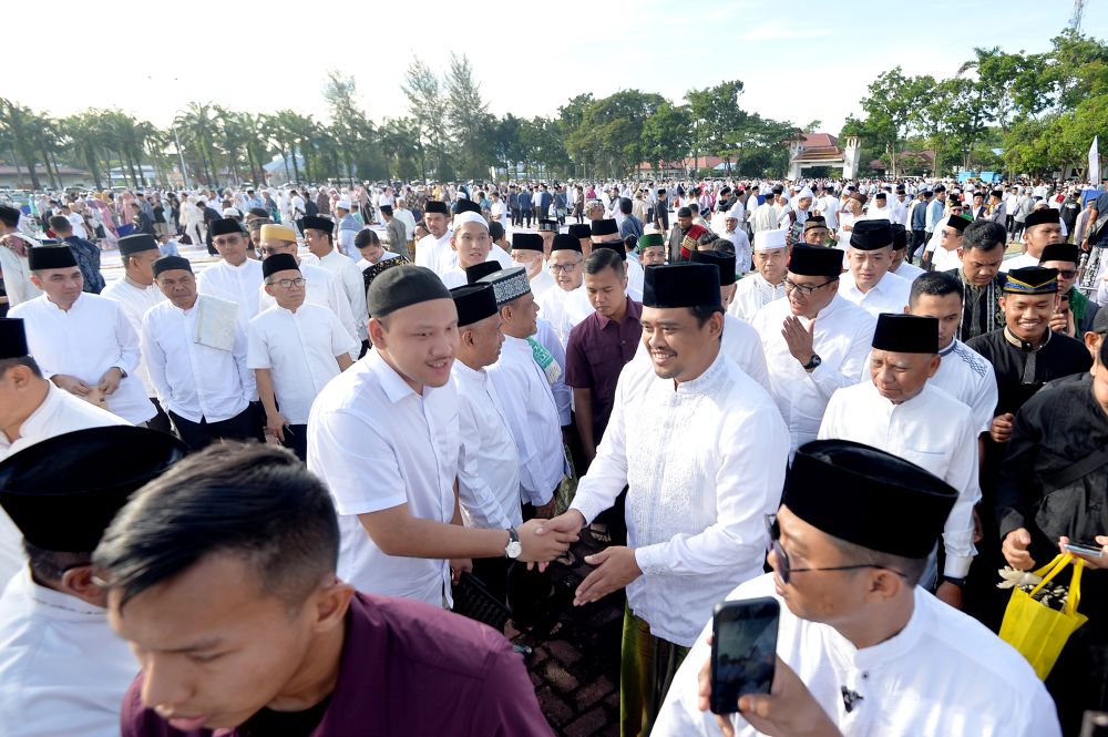 Gubernur Bobby Nasution dan Wagub Surya yang tiba sekitar pukul 07.00 WIB, turut melantunkan takbir dan tahmid bersama para jemaah lainnya. Tepat pukul 07. 25 WIB, Salat Idul Adha dilaksanakan dengan dipimpin oleh imam Ustaz Muarif Gusdriansyah.