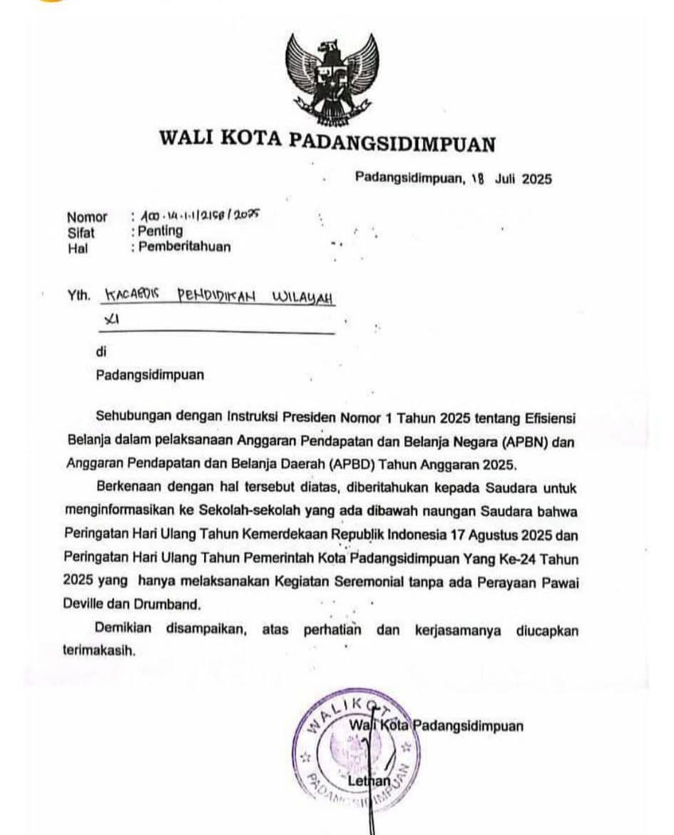 Berkenaan dengan hal tersebut di atas, di beritahukan kepada saudara untuk menginformasikan ke sekolah-sekolah yang ada di bawah naungan saudara bahwa peringatan Hari Ulang Tahun Kemerdekaan Republik Indonesia 17 Agustus 2025 dan peringatan Hari Ulang Tahun Pemerintah Kota Padangsidimpuan yang ke 24 Tahun 2025, yang hanya melaksanakan seremonial tanpa ada perayaan pawai Deville dan Drumband.