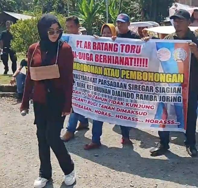 Demonstran membawa Spanduk Bertuliskan, PTAR Batangtoru diduga Berhianat!!!, Stop. Pembodohan dan Pembohongan terhadap Masyarakat Parsadaan Siregar, Siagian, Boru dohot Bere Keturunan Djaindo Ramba Joring, kurang kebih 10 Tahun tidak kunjung menerima Ganti Rugi atas Tanah Hak Mereka”, begitulah tertulis bacaan di baliho yang dibawa para aksi pengunjuk rasa.