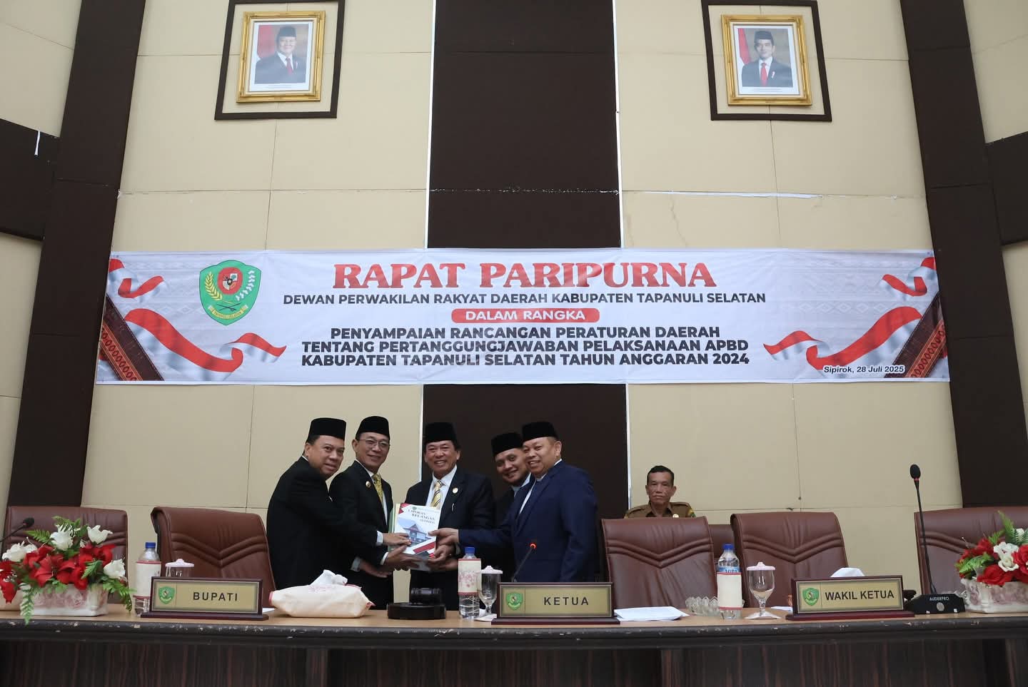 TAPANULI SELATAN, hariantabagsel.com– Bupati Tapanuli Selatan (Tapsel), H. Gus Irawan Pasaribu, didampingi Wakil Bupati, Jafar Syahbuddin Ritonga, serahkan Laporan Pertanggungjawaban (LPJ) Anggaran Pendapatan dan Belanja Daerah (APBD) tahun anggaran 2024 ke DPRD, Senin (28/7/2025).