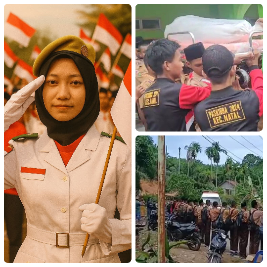 Dalam proses pemakaman di TPU Desa Sikara-kara Kampung, terlihat rekan-rekan almarhumah Diva di Paskibra Kecamatan Natal 2025 turut mengangkat kerandanya dari Masjid ke TPU.