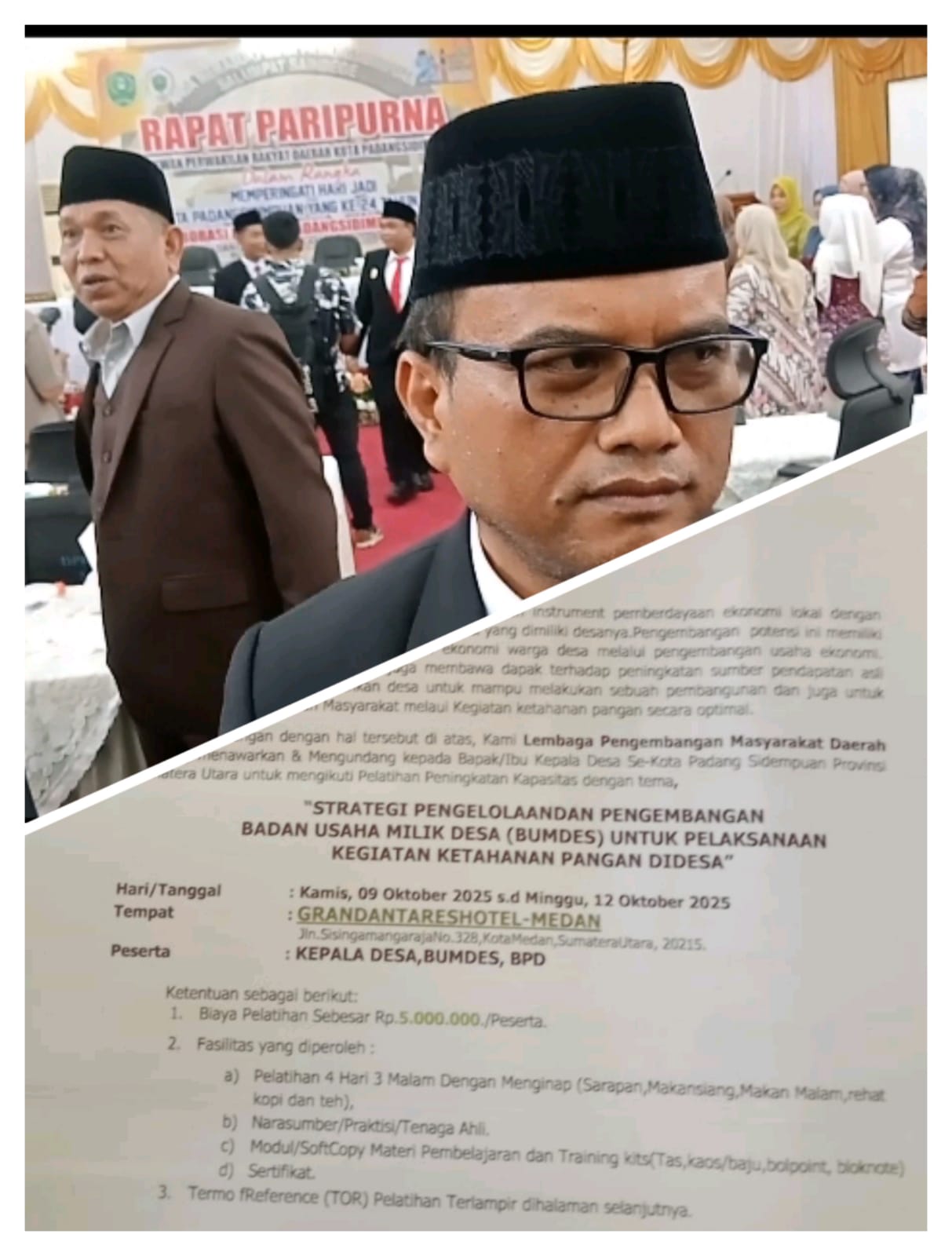Sebelumnya, sebanyak 42 Desa di Kota Padangsidimpuan berangkat bersama-sama ke Kota Medan untuk menghadiri Bimtek dengan peserta sebanyak 125 orang dengan biaya Rp.5 Juta per orang dengan total Rp.630 Juta, Jum’at, 10 Oktober 2025.