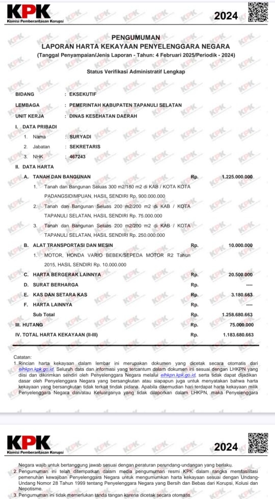 TAPANULI SELATAN, hariantabagsel.com– Laporan harta kekayaan Sekretaris Dinas Kesehatan Kabupaten Tapanuli Selatan (Tapsel), Suryadi, menjadi sorotan publik.
