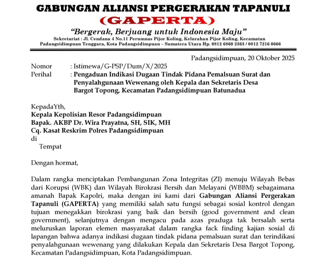 PADANGSIDIMPUAN, hariantabagsel.com– Gabungan Aliansi Pergerakan Tapanuli (GAPERTA) secara resmi melayangkan pengaduan ke Polres Padangsidimpuan terkait dugaan tindak pidana pemalsuan tanda tangan di sejumlah surat dan penyalahgunaan wewenang yang diduga dilakukan oleh Kepala dan Sekretaris Desa Bargot Topong, Kecamatan Padangsidimpuan Batunadua. Laporan ini dilayangkan pada tanggal 20 Oktober 2025.