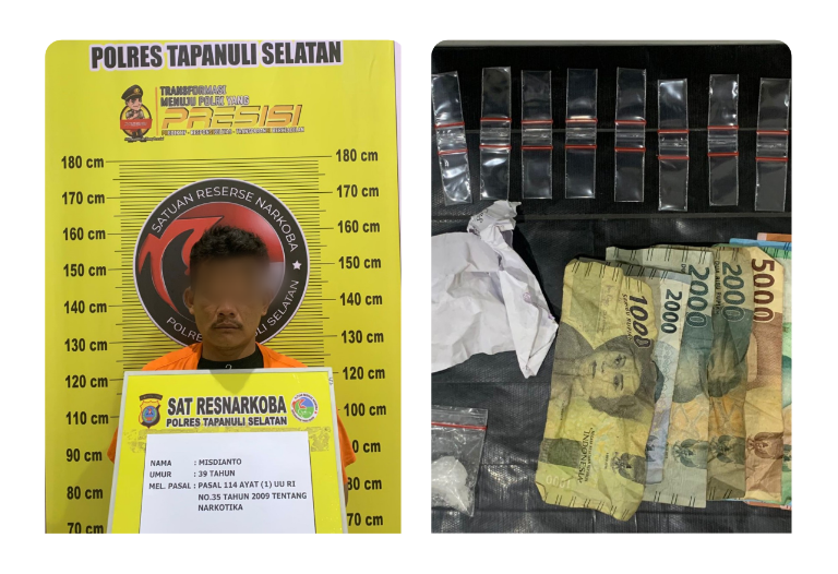 AH diamankan, Rabu (22/10/2025) sekitar pukul 18.30 WIB di Desa Sihopuk Baru, Kecamatan Halongonan Timur, Kabupaten Paluta, atas dugaan peredaran narkotika jenis sabu. AH diringkus tepat di depan rumah milik warga.