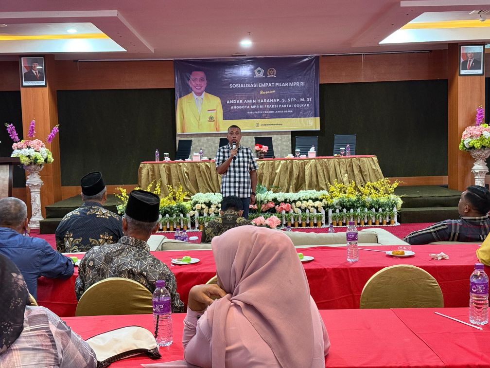 PADANG LAWAS UTARA, hariantabagsel.com– Anggota Komisi II DPR RI dari Fraksi Partai Golkar, Andar Amin Harahap, menggelar kegiatan Sosialisasi Empat Pilar MPR RI yang dihadiri oleh para tokoh masyarakat di Kabupaten Padang Lawas Utara. Kegiatan ini bertujuan untuk memperkuat pemahaman dan pengamalan nilai-nilai dasar kehidupan berbangsa dan bernegara di tengah dinamika sosial yang semakin kompleks.