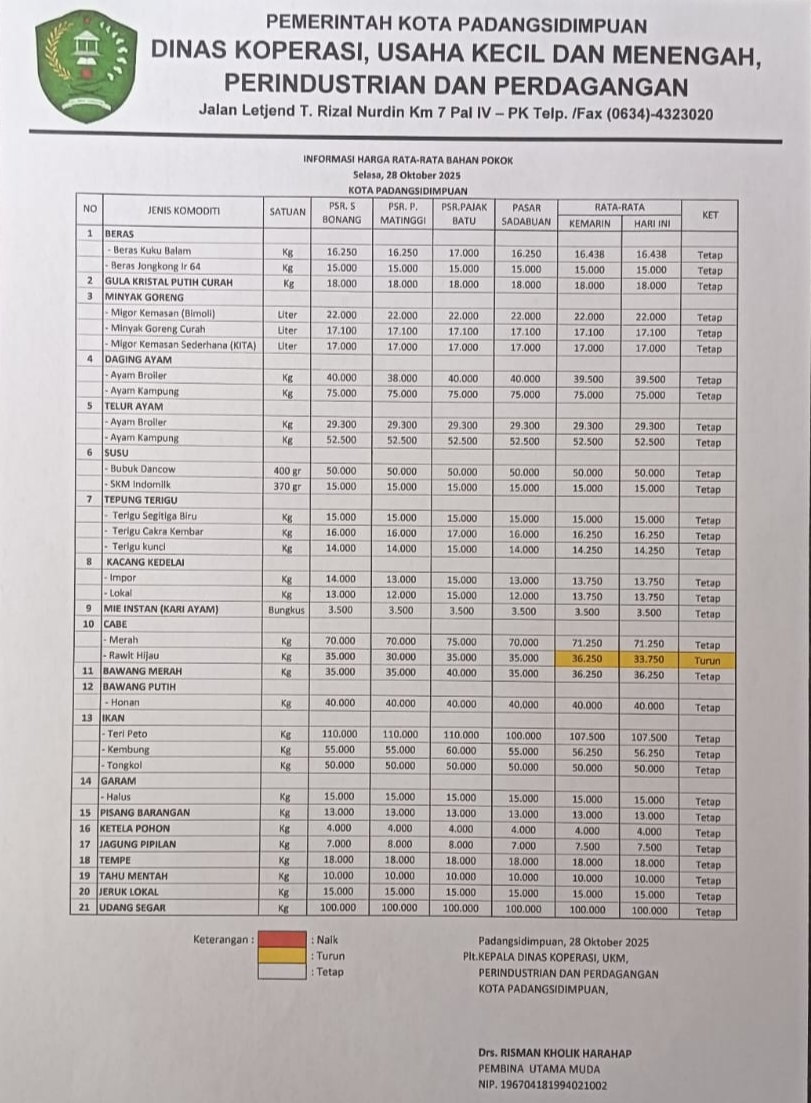 “Pemko Padangsidimpuan juga sudah berupaya dengan melakukan GPM keliling di 6 Kecamatan. Kita sudah membuat GPM keliling sejak tgl 25 s.d 27 Oktober 2026 di 6 titik Desa/ Kelurahan yang salah satu komoditas nya cabe merah, bawang merah, beras, minyak kita, Gula. Berdasarkan laporan dari tim, harga cabai merah di pasar sekarang sudah turun alhamdulillah Rp 71 ribu per kilogramnya,” bebernya.