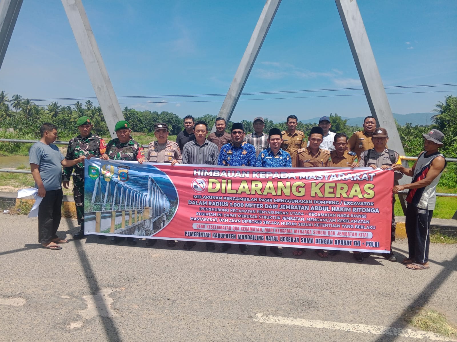 MANDAILING NATAL, hariantabagsel.com– “Inda mangantak mangan, Inda manggangu marusaho, dohot menyampaikan adong izin sanga inda,” kalimat itulah yang diucapkan rombongan Forkopimca yang hadir di bawah jembatan Naga Juang, Selasa (28/10) dalam rangka sosialisasi tidak mengambil galian c radius 509 meter dari jembatan.
