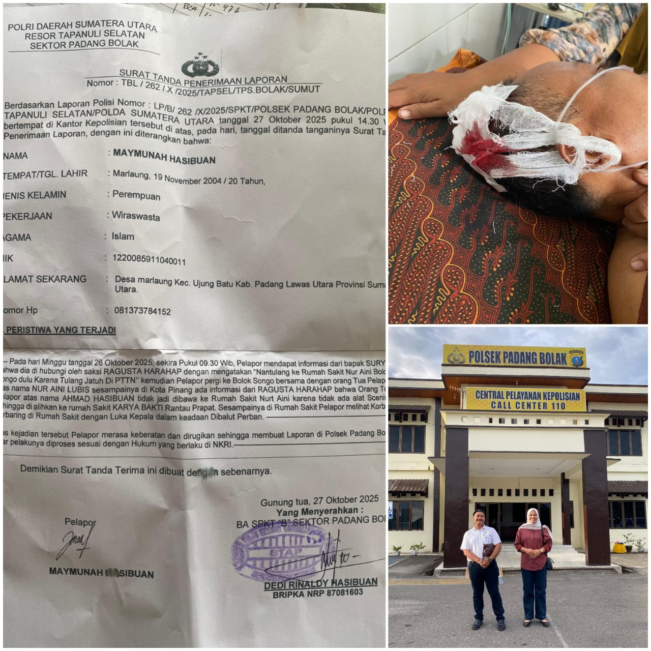 Pada hari Minggu tanggal 26 Oktober 2025, sekira Pukul 09.30 Wib, pelapor mendapat informasi dari bapak Surya bahwa dia di hubungi oleh saksi Ragusta Harahap dengan mengatakan “Nantulang ke Rumah Sakit Nurt Aini Blok Songo dulu Karena Tulang Jatuh Di PTTN” kemudian Pelapor pergi ke Blok Songo bersama dengan orang tua Pelapor atas nama Nur Aini Lubis. Sesampainya di Kota Pinang ada informasi dari Ragusta Harahap bahwa orang tua pelapor atas nama Ahmad Hasibuan tidak jadi dibawa ke Rumah Sakit Nurt Aini karena tidak ada alat Scanning sehingga di alihkan ke rumah Sakit Karya Bakti di Rantau Prapat. Sesampainya di Rumah Sakit, pelapor melihat korban terbaring di Rumah Sakit dengan luka kepala dalam keadaan dibalut perban.