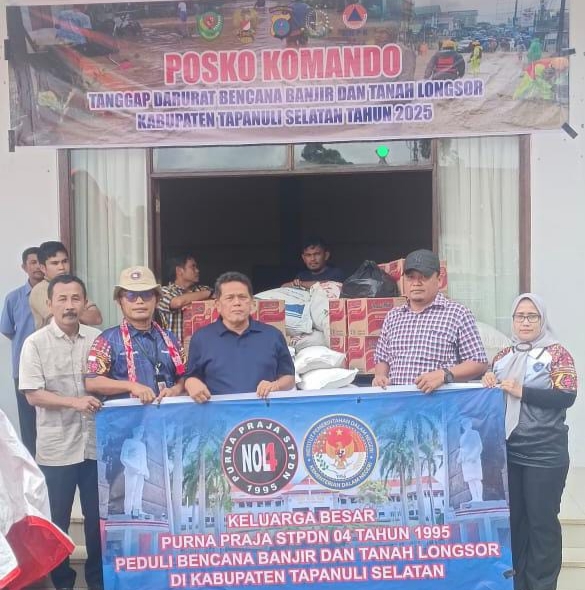 Keluarga Besar Purna Praja Angkatan 04 STPDN Tahun 1995 menyerahkan bantuan Sembako berupa Beras, Gula Pasir, Mie Instant, Minyak Goreng dan Susu Kental Manis ke Posko Komando Tanggap Darurat Bencana Banjir dan Tanah Longsor di Kabupaten Tapanuli Selatan, Jumat (5/12/2025) siang.