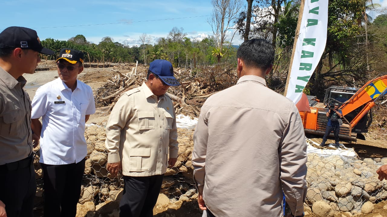 Prabowo menyusuri jembatan, berjalan dari ujung ke ujung, sambil melihat ke sekeliling yang masih banyak tumpukan kayu-kayu, material banjir.
