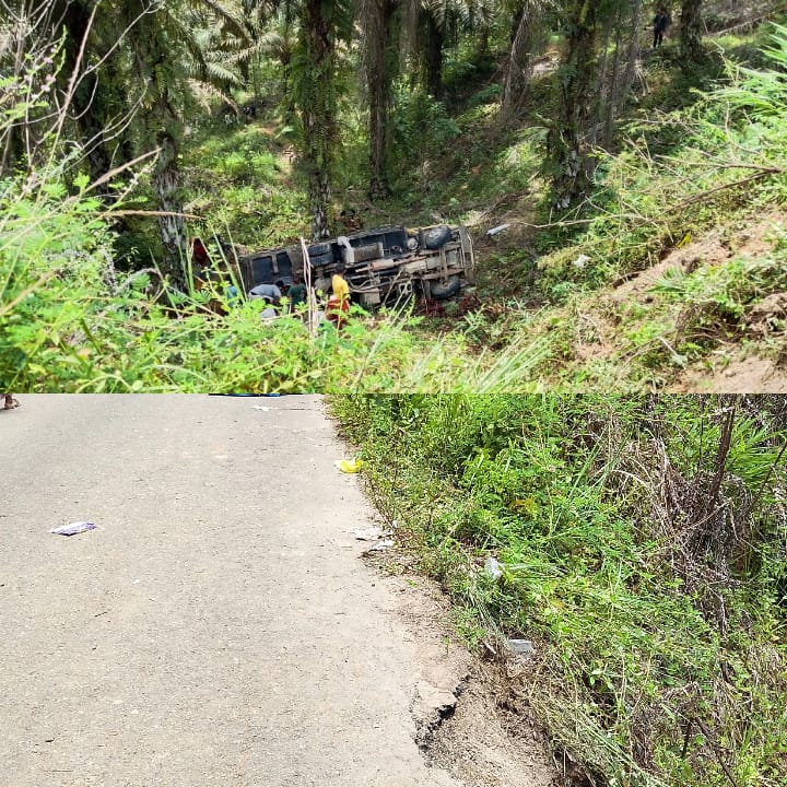 Insiden kecelakaan terjatuhnya salah satu mobil Colt Disel pengangkut sawit diduga terjadi saat antara dua unit kenderaan berpapasan di jalan sempit dan disalah satu sekitar bahu jalan ada jurang.